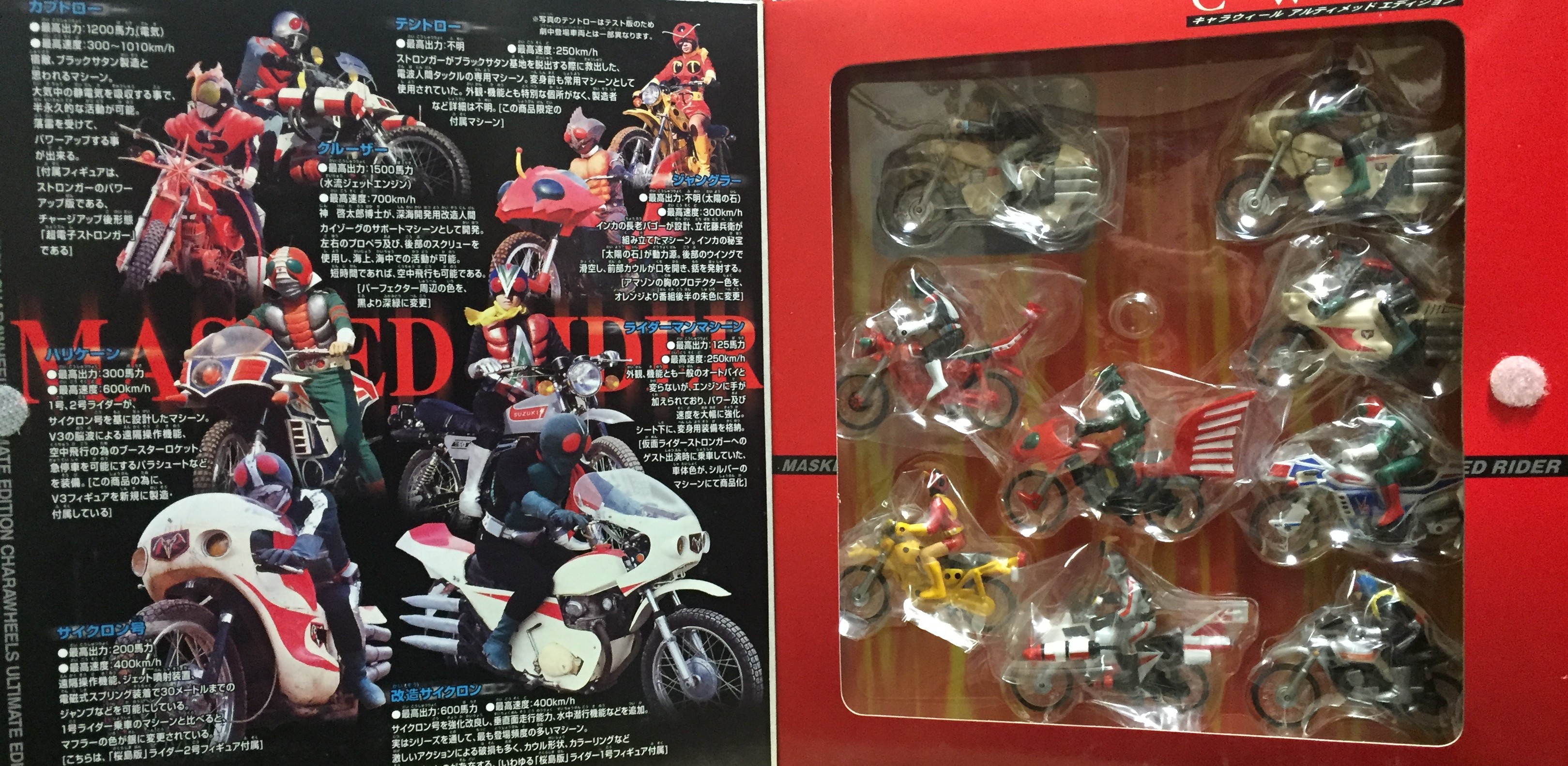 特典としてサイクロン号&本郷猛が入っているので、栄光の8人ライダーマシーンとありますが9個セットとなります。