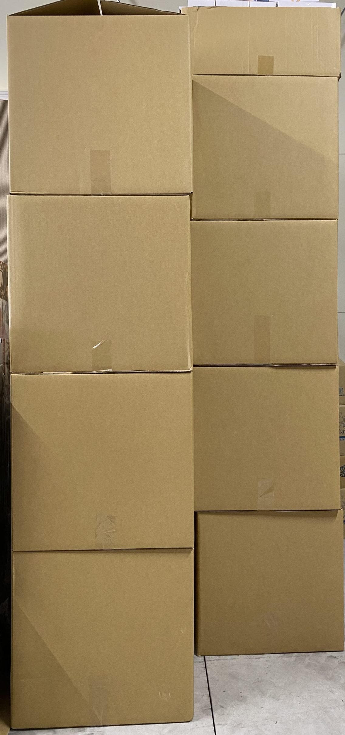 当店が使っている大型ダンボールの山です。画像ではわからないかもしれませんが、160サイズ(3辺の長さが合計160cm)のダンボールです。小柄な成人女性が入れるくらいのサイズとお考えください。