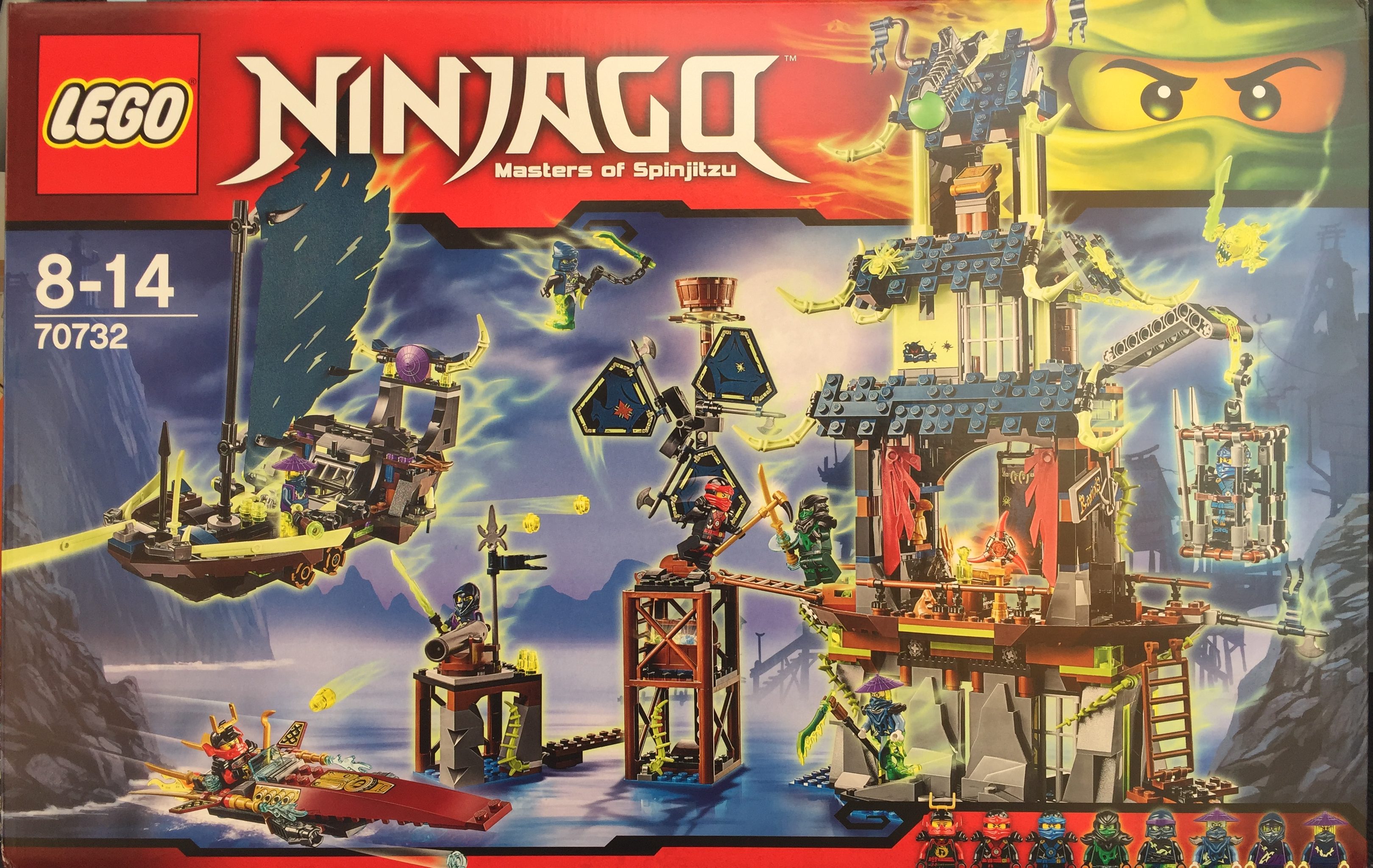 カイ、ジェイ、ニャ、イービル・グリーン・ニンジャ、チェーン・マスター・ラス、大鎌マスター・ゴウルター、ゴースト戦士サイラス、ゴーストニンジャ・ミン、以上8体のフィグとアクセサリーパーツ付き。