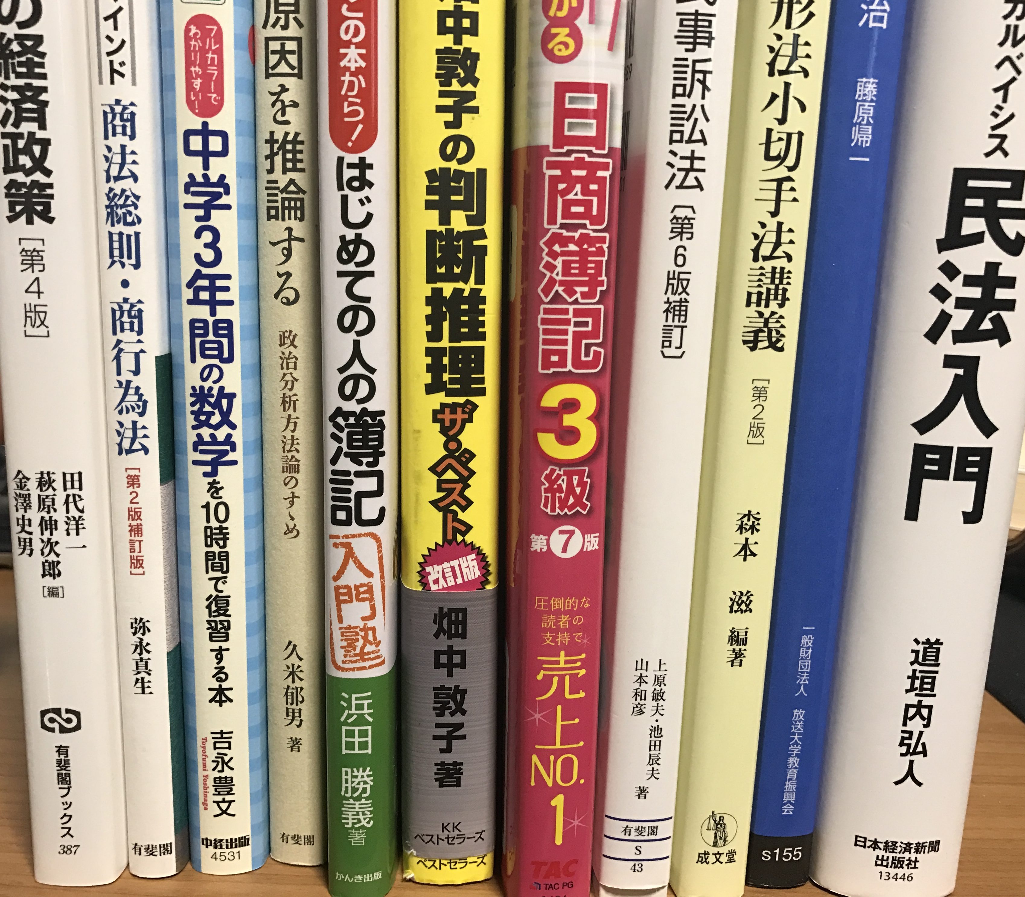 商法、小切手法、民事訴訟法など法律関係や、判断推理など公務員試験で使われる専門書が有りますね。