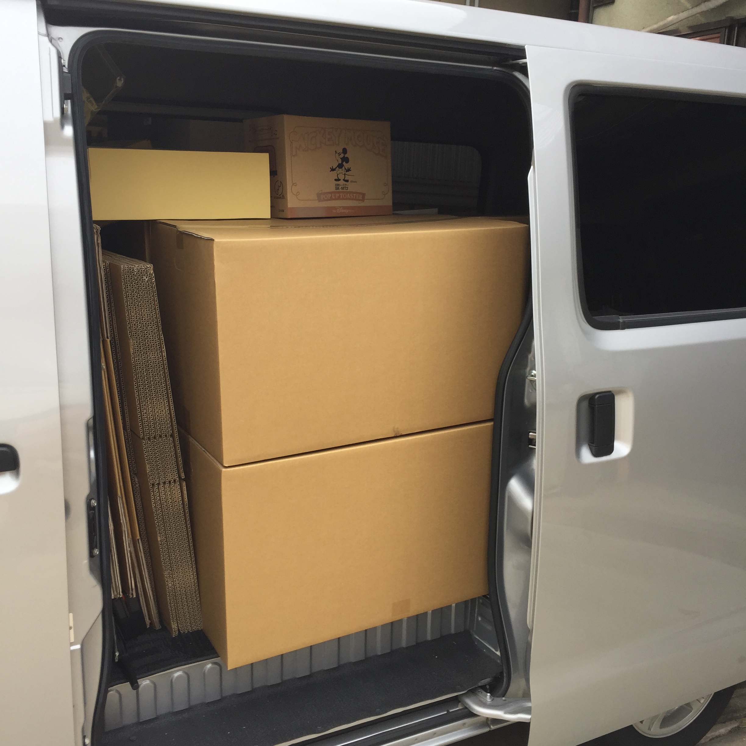 出しては箱詰め、詰めては運び出しの連続。ハイエース1台+ライトエース1台が満載となりました。