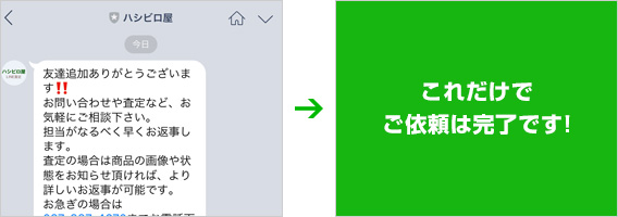 後はハシビロ屋にメッセージを送るだけ! アイテムの写真もスマートフォンで撮って送 ればOK!査定、買取のご依頼、その他お問い 合わせなどお気軽にどうぞ。